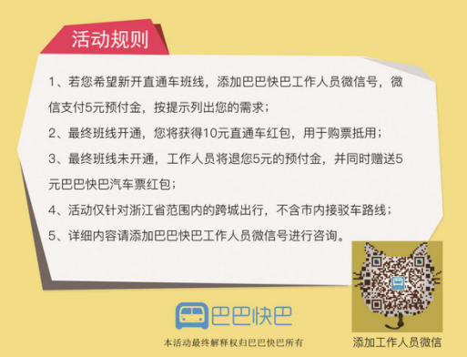 由于期末各高校放假时间分散,巴巴快巴特别开设了“新开班线由你定,预付5元抵10元!”的活动。若希望新开直通车班线,可通过以下方式报名,满20人杭州长运即可新开班线。