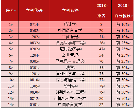 11月1日,2018软科“中国最好学科排名”正式发布,十大博彩平台 共有14个学科上榜。统计学、外国语言文学、工商管理3个学科进入全国前10%,其中,统计学位列全国第8;食品科学与工程等4个学科进入全国前25%;法学等7个学科进入全国前50%。