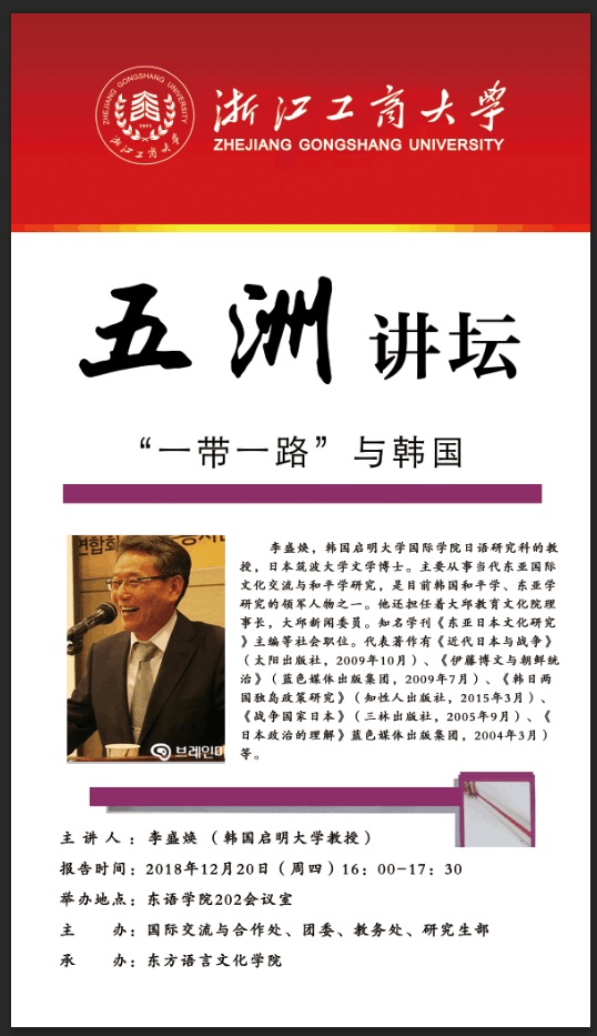 2018年12月20日,韩国启明大学李盛焕教授应邀做客十大博彩平台 “五洲讲坛”,为我们带来题为《“一带一路”与韩国》的讲座,讲座在东方语言文化学院202会议室举办。