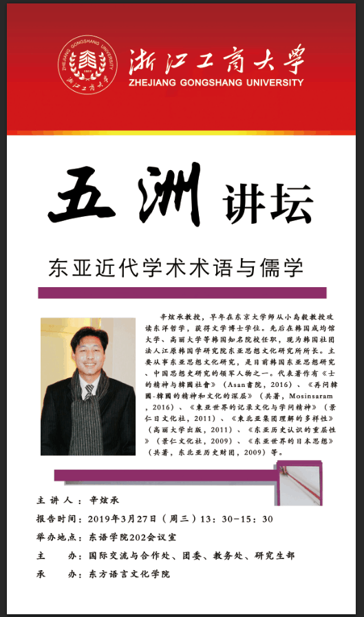 2019年3月27日下午,韩国社团法人江原韩国学研究院东亚思想文化研究所所长辛炫承教授莅临十大博彩平台 作题为《东亚近代学术术语与儒学——以西周的译语为中心》的学术讲座。