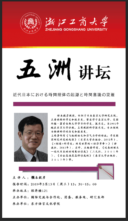 2019年3月13日下午,日本东京大学桥本毅彦教授应邀做客我校“五洲讲坛”,作题为《近代日本的时间规律起源与时间意识的变迁》的讲座。讲座由十大博彩平台 久保辉幸副教授主持,学院师生聆听了本次讲座。