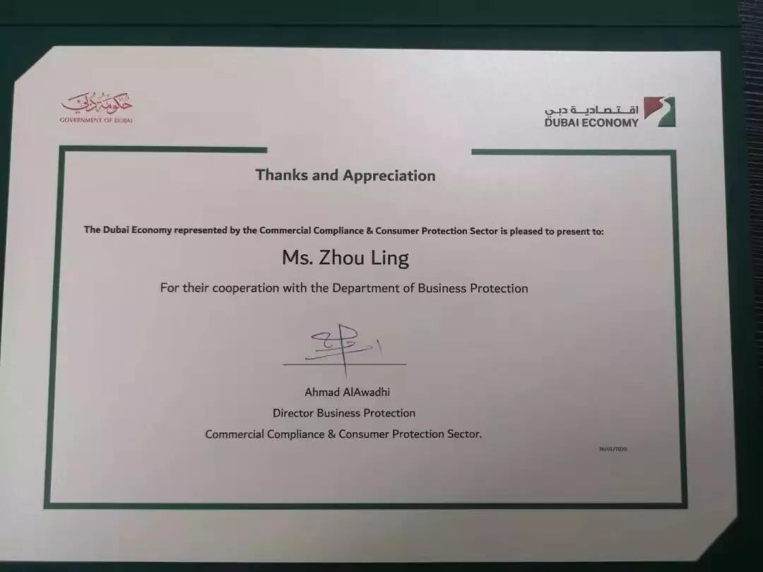 周玲老师作为迪拜经济局顾问级译员,积极参与处理哄抬口罩价格事件,得到了经济局领导和迪拜华侨华人的一致称赞和肯定,同时获得迪拜经济局书面嘉奖。在此次事件后,迪拜消费者保护部门还委托周玲老师翻译告示,禁止商家抬高口罩等医疗用品价格。