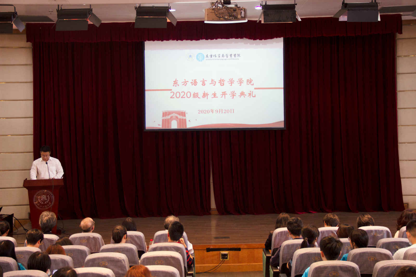 9月20日下午,东方语言与哲学学院在图书馆一楼报告厅隆重举行2020级新生开学典礼。校党委副书记李军亲临现场并讲话,学院院长江静、党委书记周宏力、副院长吴玲及董科出席典礼。典礼由学生工作办公室主任兰大伟主持。