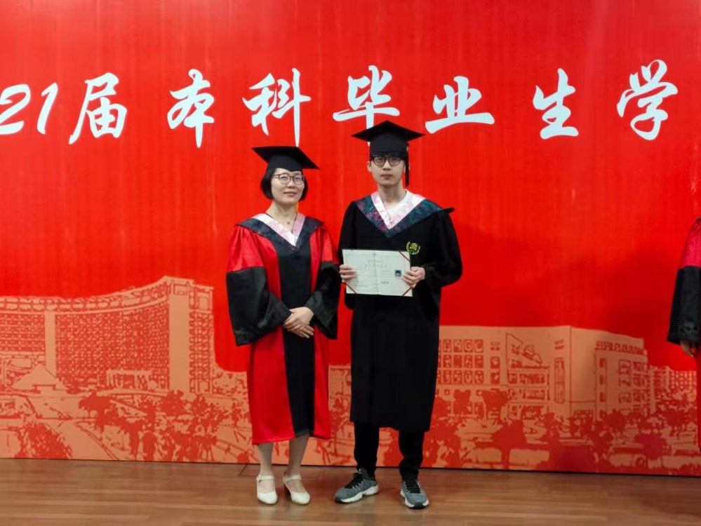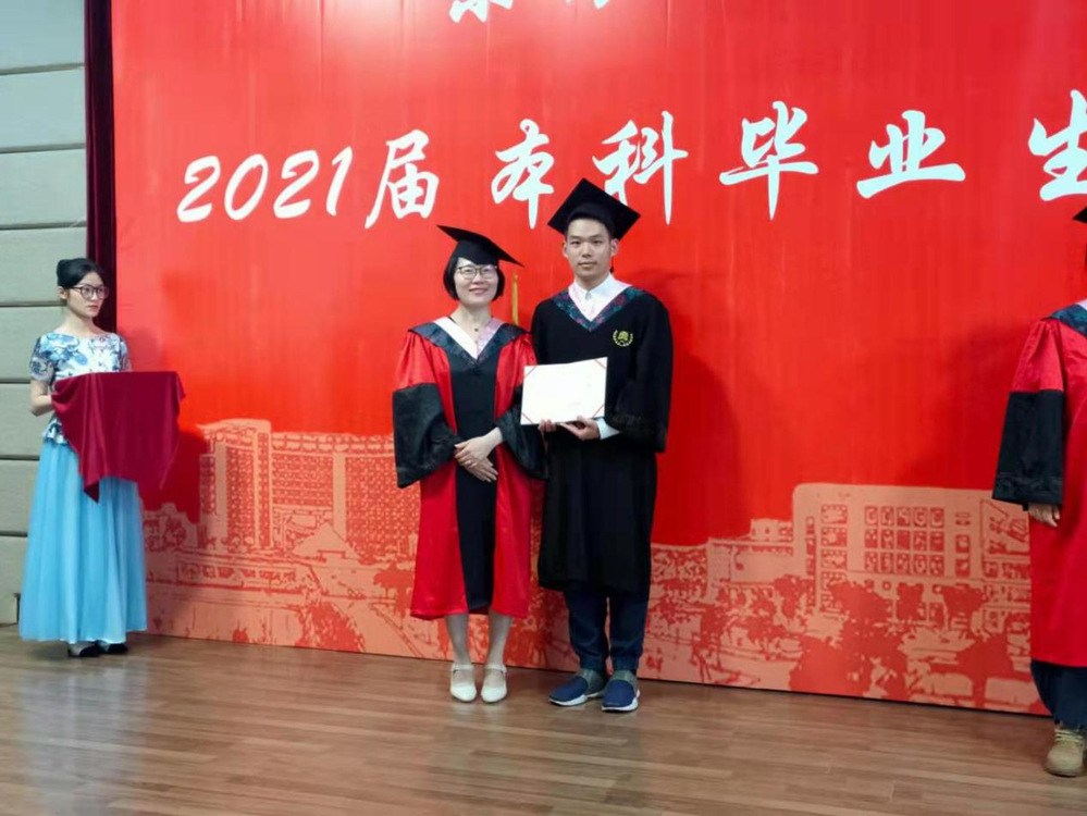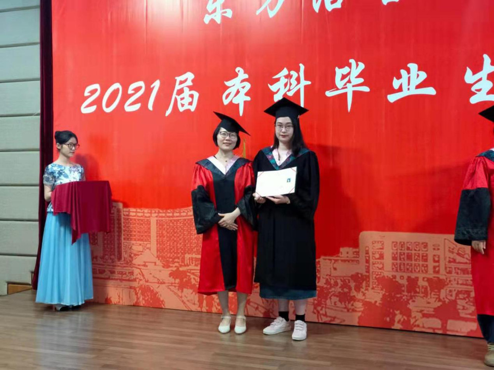 拨穗后,毕业生快步行至江静院长左侧,由江院长为其授予学位证书并合影留念。