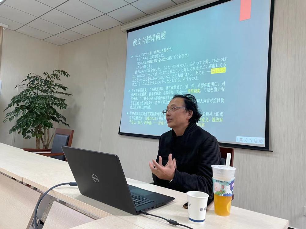 随后,刘晓芳教授提出“经典新读式文学细读方法论”,介绍了如《罗生门》《心》《棉被》等诸多名著。并对从中挑选出经典段落,进行了细读、翻译的实际运用,使在场师生受益良多。