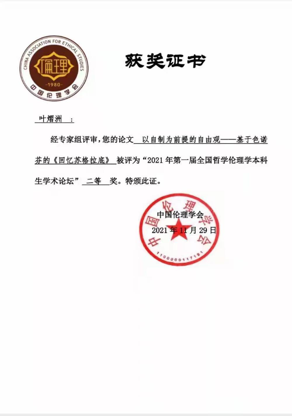 11月26日—28日,中国伦理学会、《应用伦理研究》编委、西南大学教务处、西南大学国家治理学院哲学系联合举办“2021年第五届全国哲学伦理学博士生学术论坛暨全国哲学专业本科生学术论坛”,十大博彩平台 哲学系1901班叶熠洲同学的论文“以自制为前提的自由观——基于色诺芬的《回忆苏格拉底》”在此次论坛中被评为本科生组二等奖,论文由陈郑双老师指导。这是哲学系本科生第一次参与该项全国性专业赛事并获奖。