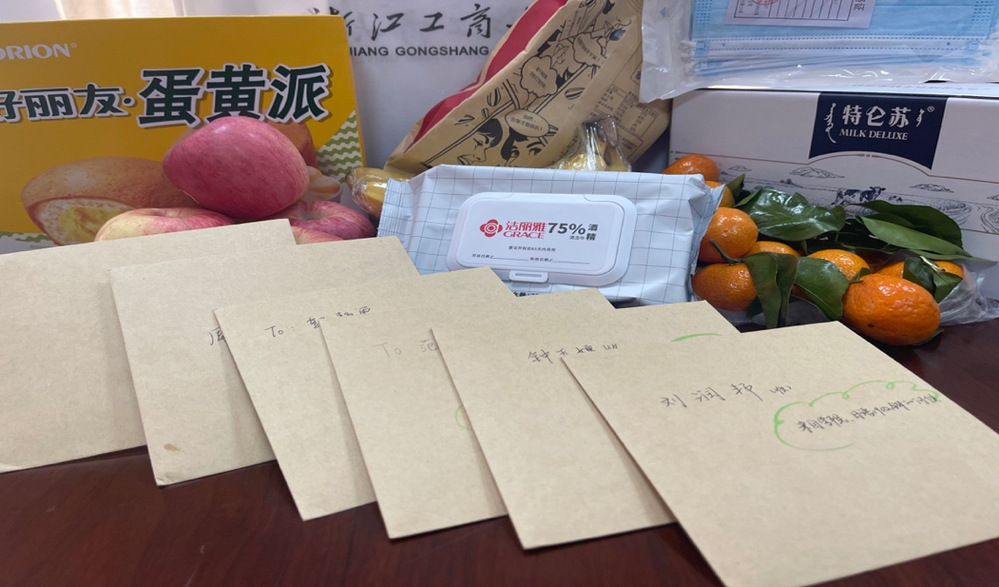 隔离不隔爱,防疫有温情。学院领导高度关注隔离留观学生情况,通过隔离留观学生线上交流群及时了解学生身心状况,生活、学习情况与需求,力争做好学生心理疏导工作,同时也希望同学们配合疫情防控要求,保持良好心态,合理安排作息,认真学习网课,确保学业跟进。学生工作办公室(“彩虹桥” 辅导员工作室)成员在学院领导指导下落实慰问工作。学办主任兰大伟、辅导员杨月燕、沈霄鹏、叶俊倩、沙梦怡为隔离学生送去“彩虹桥爱心大礼包”。除基础防疫、慰问物资外,每份“彩虹桥爱心大礼包”内还有一张满含学院、隔离留观学生班级、寝室同学关怀话语的暖心卡,为学生送去学院的人文关怀。