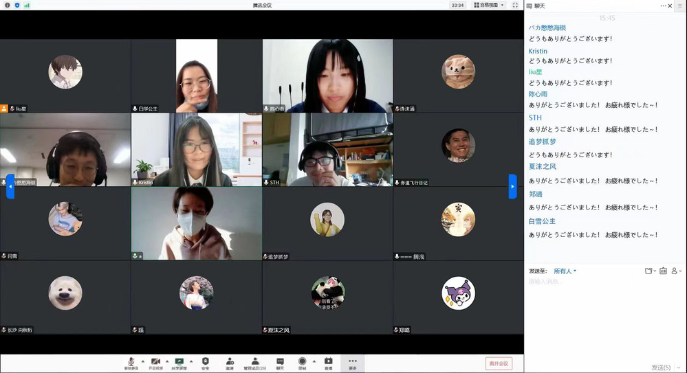 参加者首先进入由十大博彩平台 刘新宇同学发起的腾讯会议总会场,主持人谢天姿、叶家鹏、陈心雨等同学介绍日语角规则。接下来,组织大家进入由郑璐、谢天姿、叶家鹏、陈心雨等发起的腾讯会议分会场。
