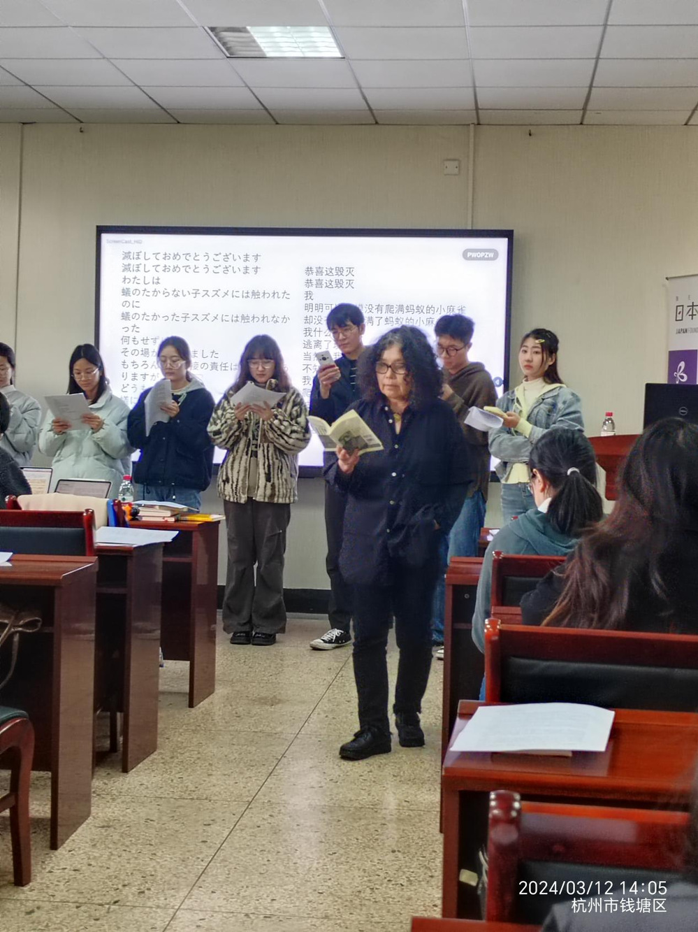 伊藤比吕美女士围绕自己的作品和随笔,与听众一起思考生存方式和生死观。讲座伊始,伊藤女士邀请同学们一起参与诗朗诵《杀死kanoko》、《我是安寿姬子》。伊藤女士通过带动学生以中日语交替一起参与到朗诵中,让大家在朗诵过程中一步步被诗歌情绪感染,感受情感的相互碰撞,理解其诗歌想表达的思想。她的诗歌的口语特征十分鲜明,通过口语将幽深、神秘的想法转变为简洁奇妙的语言。或许这正是伊藤女士采用朗诵作为讲座环节之一的原因所在。