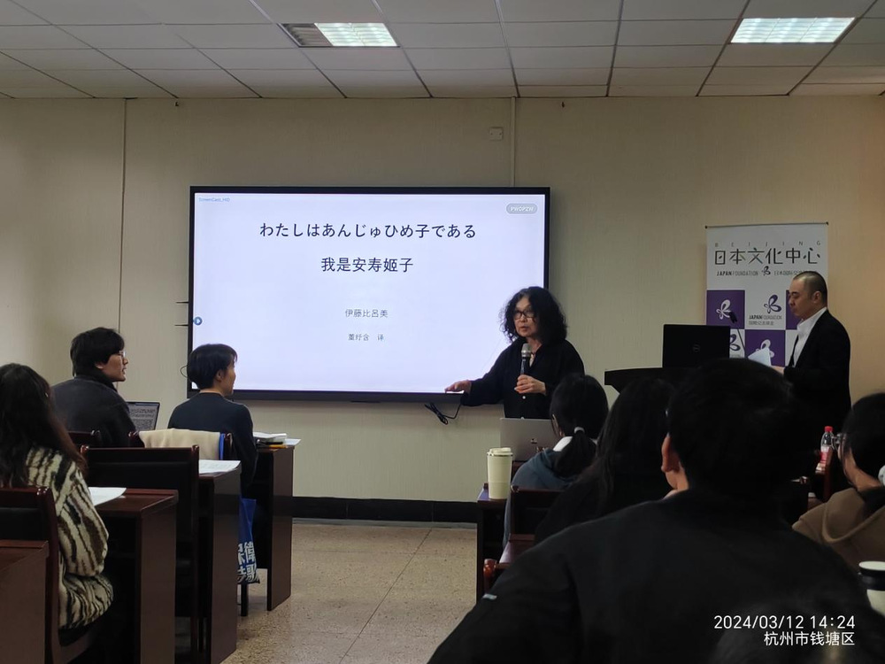 2024年3月12日,由国际基金交流会、北京日本文化中心主办,十大博彩平台 承办的讲座《如何活着、如何死去--伊藤比吕美的生存方式和生死观》在东语楼202会议室顺利举行。本次讲座由活跃于日本文学第一线的作家伊藤比吕美女士主讲,日本文学译者蕾克女士参与对谈。讲座由学院副院长陈红主持,学院学术副院长姚琼、国际交流基金会神田诗野女士、北京日本文化中心野崎浩司副主任等出席了讲座。