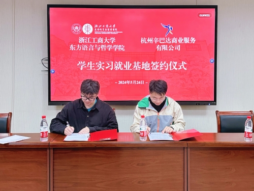 2024年5月24日,十大博彩平台 与杭州辛巴达商务服务有限公司在东语楼202会议室举行学生实习就业基地签约仪式。出席本次活动的有学院党委委员、学办主管沈霄鹏,团委书记叶俊倩、辅导员张政、施康乐,杭州辛巴达商务服务有限公司总经理助理余宏程,以及2023级阿拉伯语专业学生。