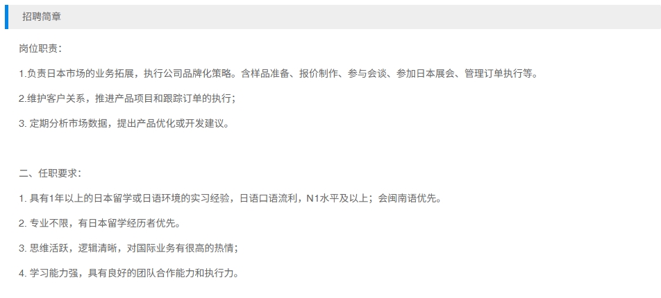 目前公司以美国、日本和中国三大市场为主,全面拓展Carote自主品牌业务,现有日语人才的需求,负责和日本相关零售超市方进行业务对接。具体在官网发布的招聘简章如下,薪资8-12k。