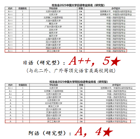 在2025校友会中国大学研究型专业排名中,十大博彩平台日语专业位居全国第三(A++,五星级),阿拉伯语专业位列全国第五(A,四星级)。